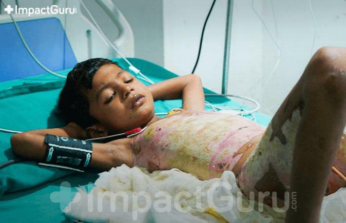 I am Pulkit’s mother, and my heart aches every day as I watch my 7-year-old son suffer in a hospital bed. Our lives changed forever around Dussehra when a terrible accident left him with severe burns. That day, there was a community feast, and while I was close by, Pulkit was playing near a large pot of hot dal. Suddenly, he stumbled and fell into it. In front of my eyes, my little boy’s body was burned, and he was screaming in pain.