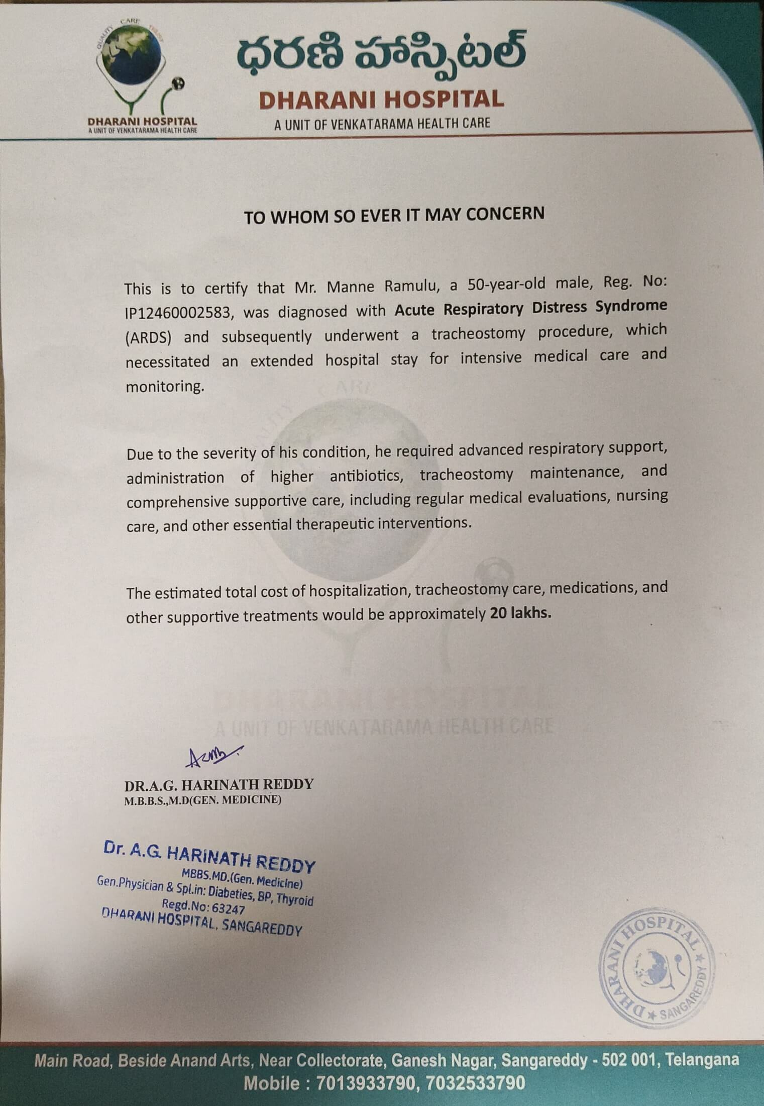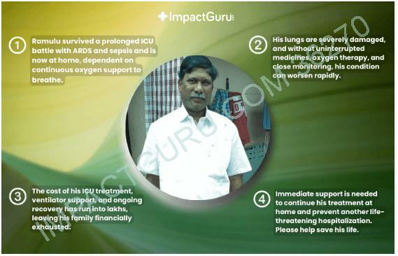 After a sudden and devastating medical collapse, my father Ramulu survived a prolonged ICU battle with ARDS, sepsis, and respiratory failure and has now been discharged home. While he is no longer on a ventilator, his fight is far from over. He depends on continuous oxygen support, medications, and close medical care to stay stable. The cost of his ICU treatment, ventilator support, and ongoing recovery has already run into lakhs, and despite our family’s best efforts, we are still falling short of the funds needed to continue his care and prevent his condition from worsening again.