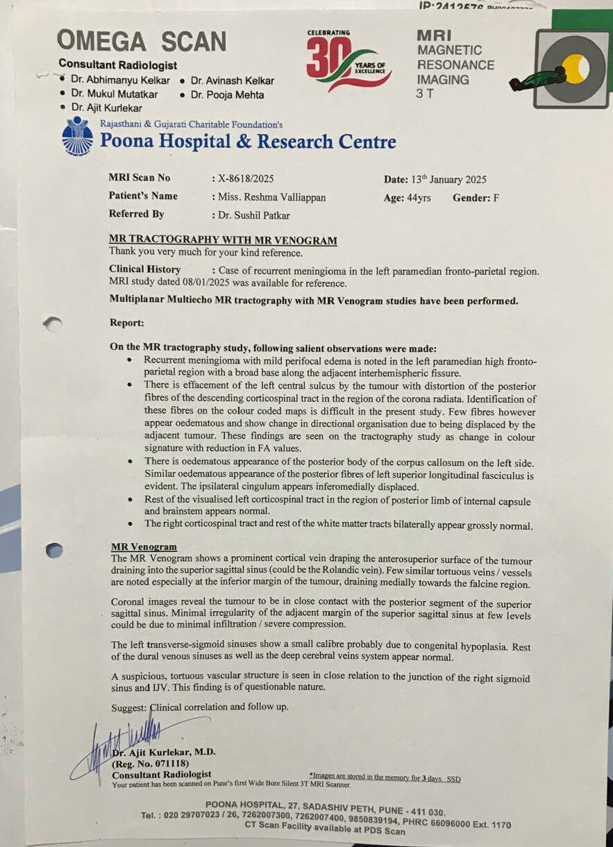 As the sole breadwinner of her family, Reshma’s illness has placed an unbearable burden on her loved ones. The diagnosis followed months of persistent headaches, partial body seizures, and difficulty concentrating—symptoms that finally revealed the life-altering condition - Brain Meningioma: A cancerous or non-cancerous mass or growth of abnormal cells in the brain.
