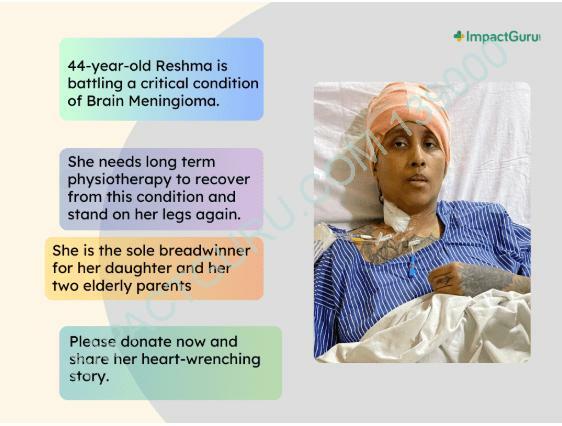 महज 44 साल की उम्र में, रेशमा को मेनिंगियोमा नामक ब्रेन ट्यूमर हो गया है, जिसके कारण वह जिंदगी और मौत से जूझ रही है।