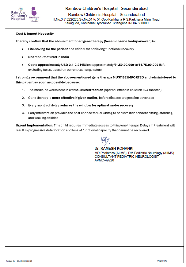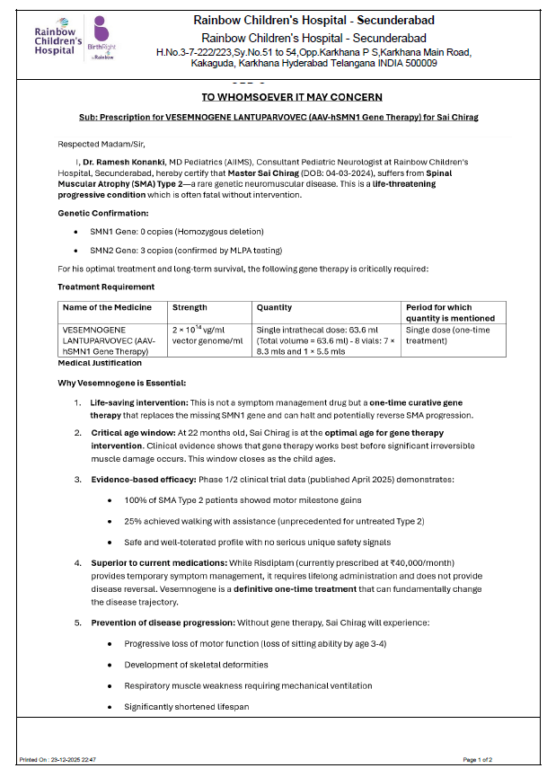 Doctors have informed us that Chirag’s only chance to stop the progression of SMA is a one-time gene therapy called Vesemnogene.