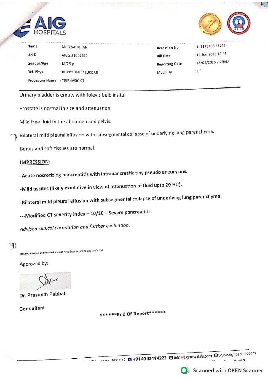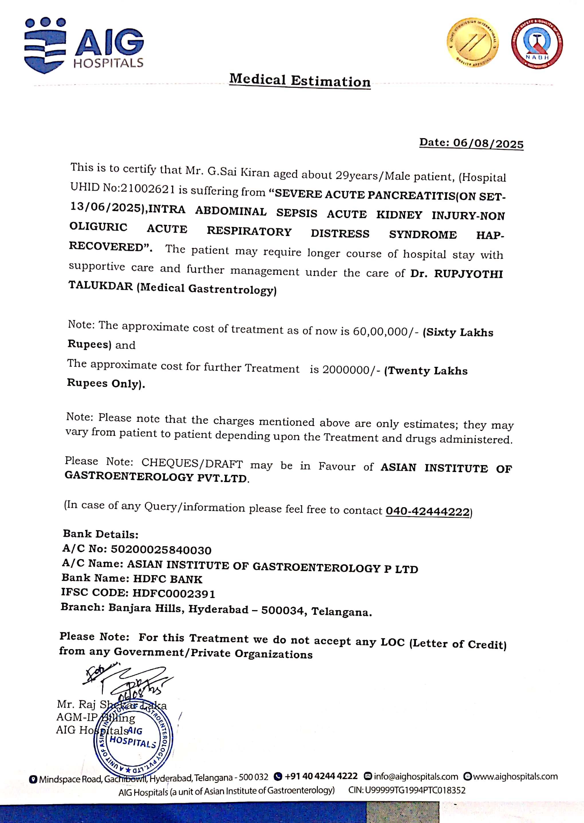 He has been in the ICU at AIG Hospitals, Hyderabad for the past 40 days, battling Acute Necrotizing Pancreatitis a severe, life-threatening condition.