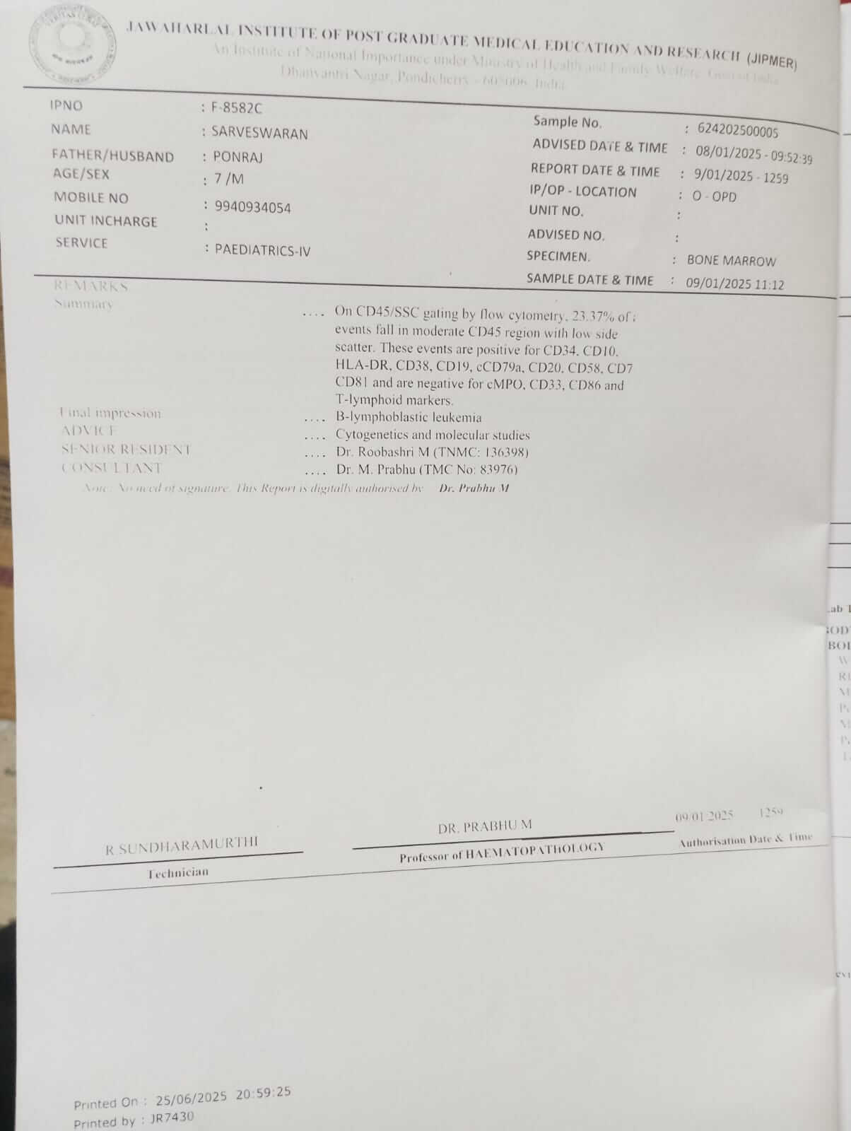 We have spent all our savings on treatments, hospitalisation, medicines, and tests. Doctors have now advised that Sarveswaran will require a Bone Marrow Transplant, which is critical for his survival. The estimated cost of the remaining treatment is between ₹25,00,000 and ₹35,00,000 — an amount far beyond our financial capacity.