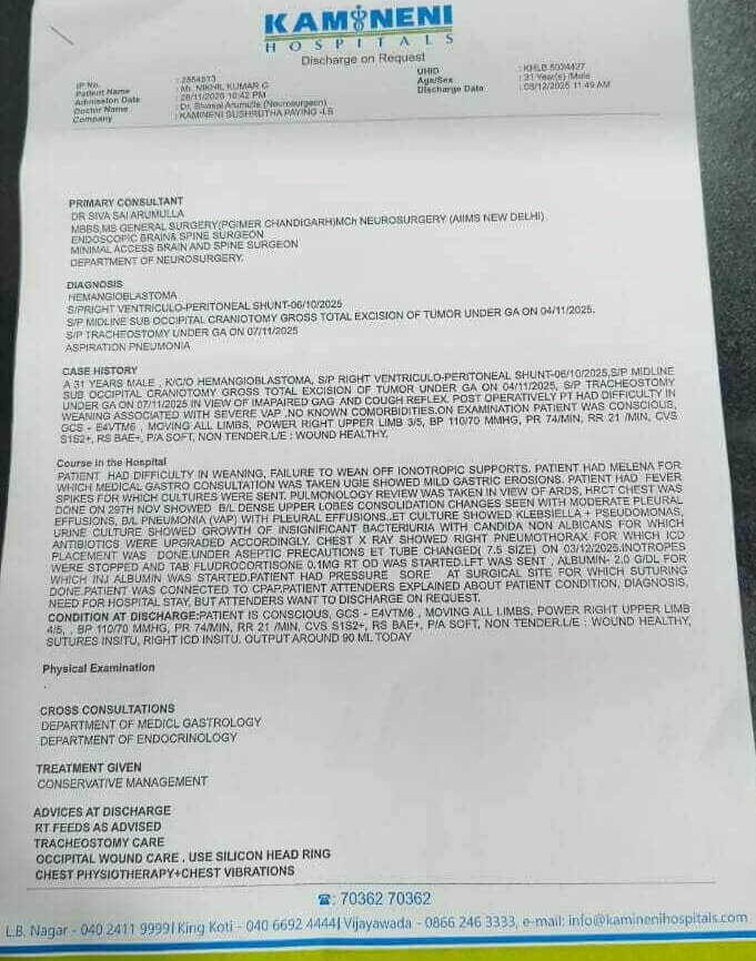 ఇప్పటివరకు స్కాన్లు, శస్త్రచికిత్స, మందులు, ఐసీయూ ఖర్చులు అన్నింటికీ కలిపి ₹15,00,000 ఖర్చు చేశాం — మేము చేయగలిగినంత అన్నీ చేశాం.