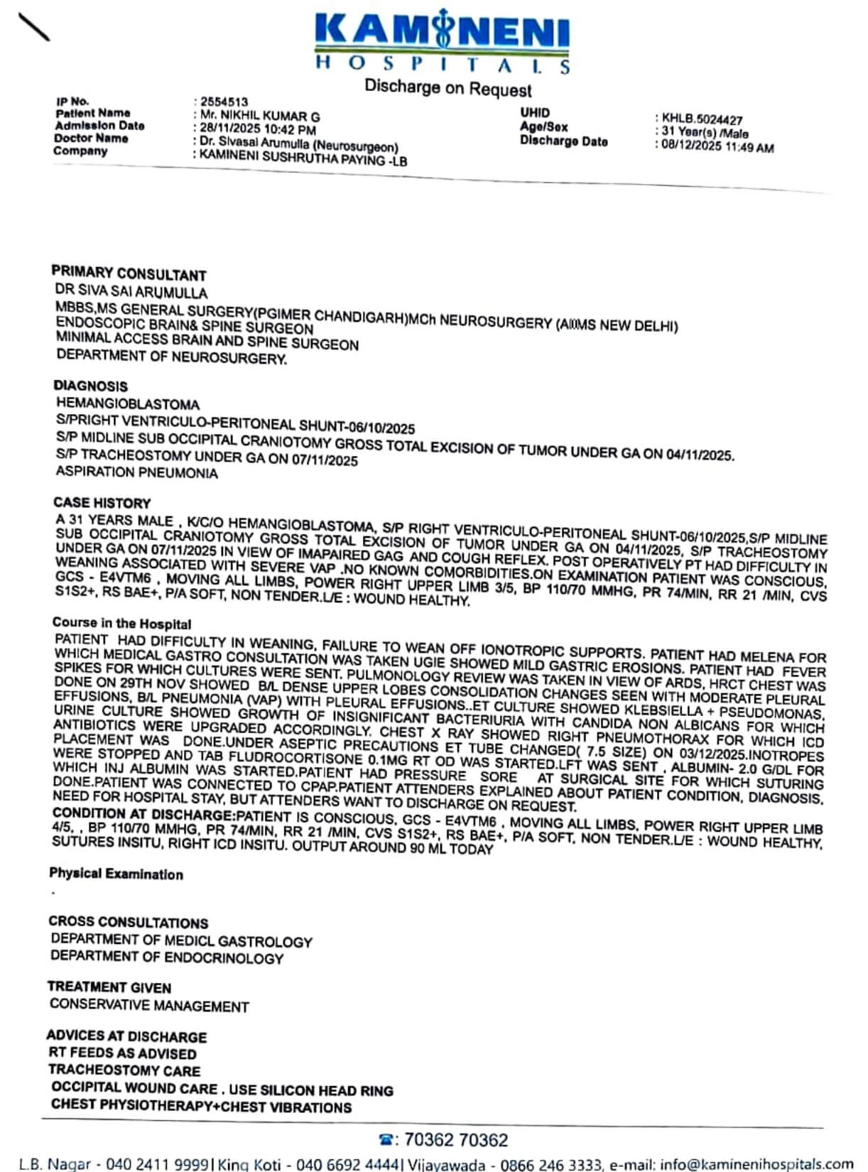నిఖిల్కు మెదడు ట్యూమర్ (Brain Tumor) అని నిర్ధారణ అయింది.