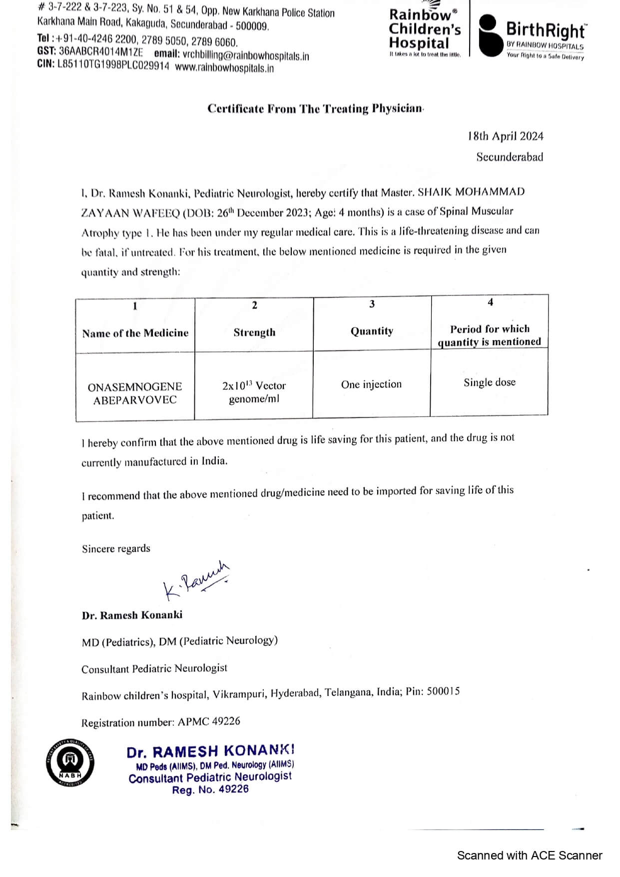 The drug costs me crores. I have taken care of Zayaan by spending a lot and also by seeking help from family, friends and colleagues but now, I need your assistance to save my baby Zayaan.