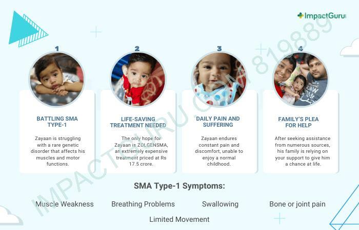 Children with type 1 have limited movement, can’t sit without support, and have trouble breathing, feeding, and swallowing. These are the symptoms that Zayaan already suffers from. Symptoms begin at birth or within the first six months of life.