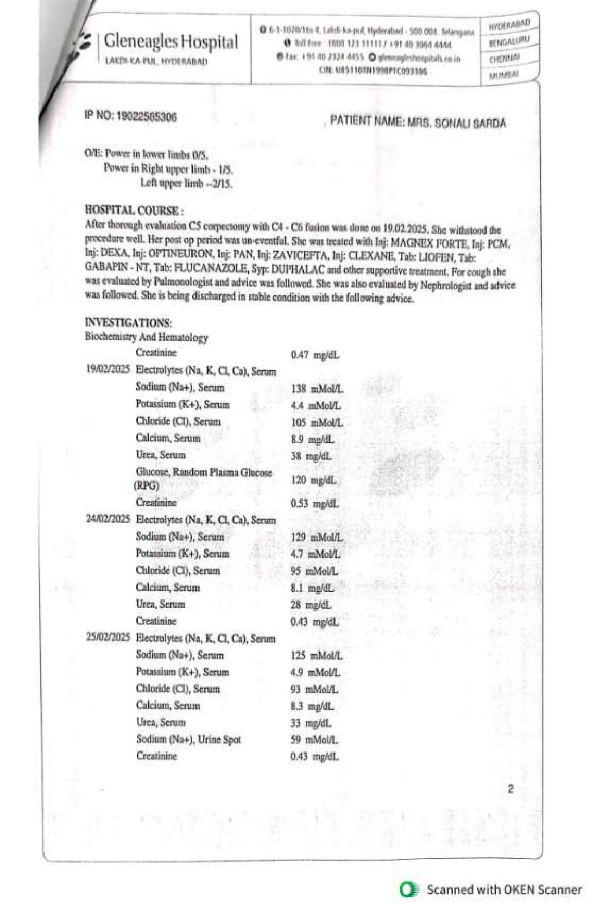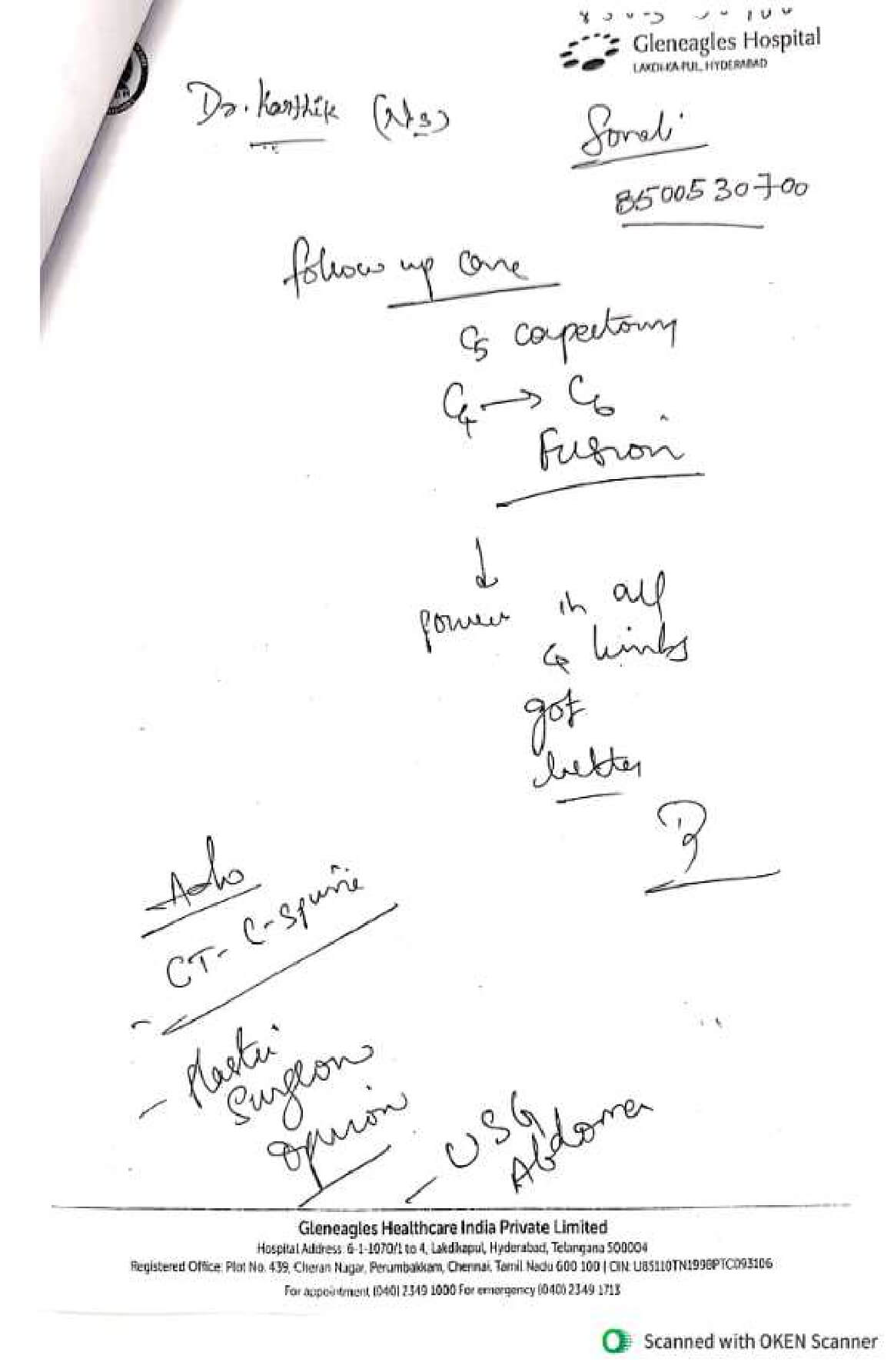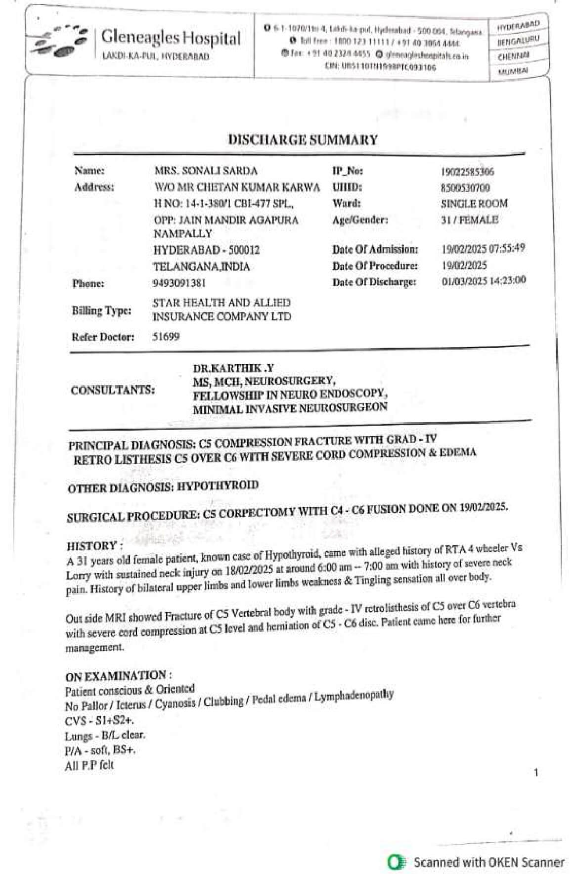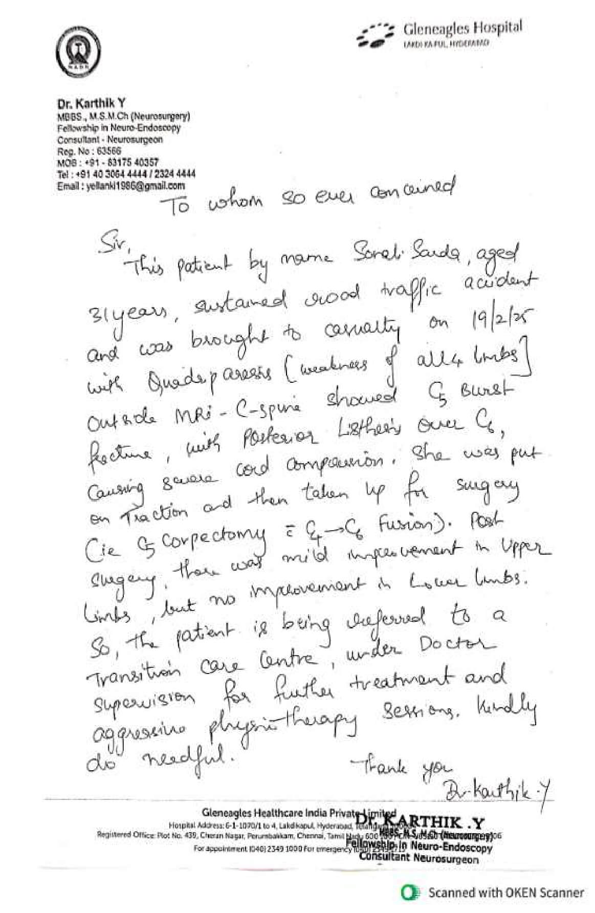 As soon as the accident happened, I lost all movement. After an MRI scan in Nagpur and consultation with the doctor, we learned that I had suffered a severe spinal cord compression and damage to the cervical C5 vertebra. Surgery was urgently needed. A few days later, my husband had to shift me to Hyderabad, where I underwent surgery.
