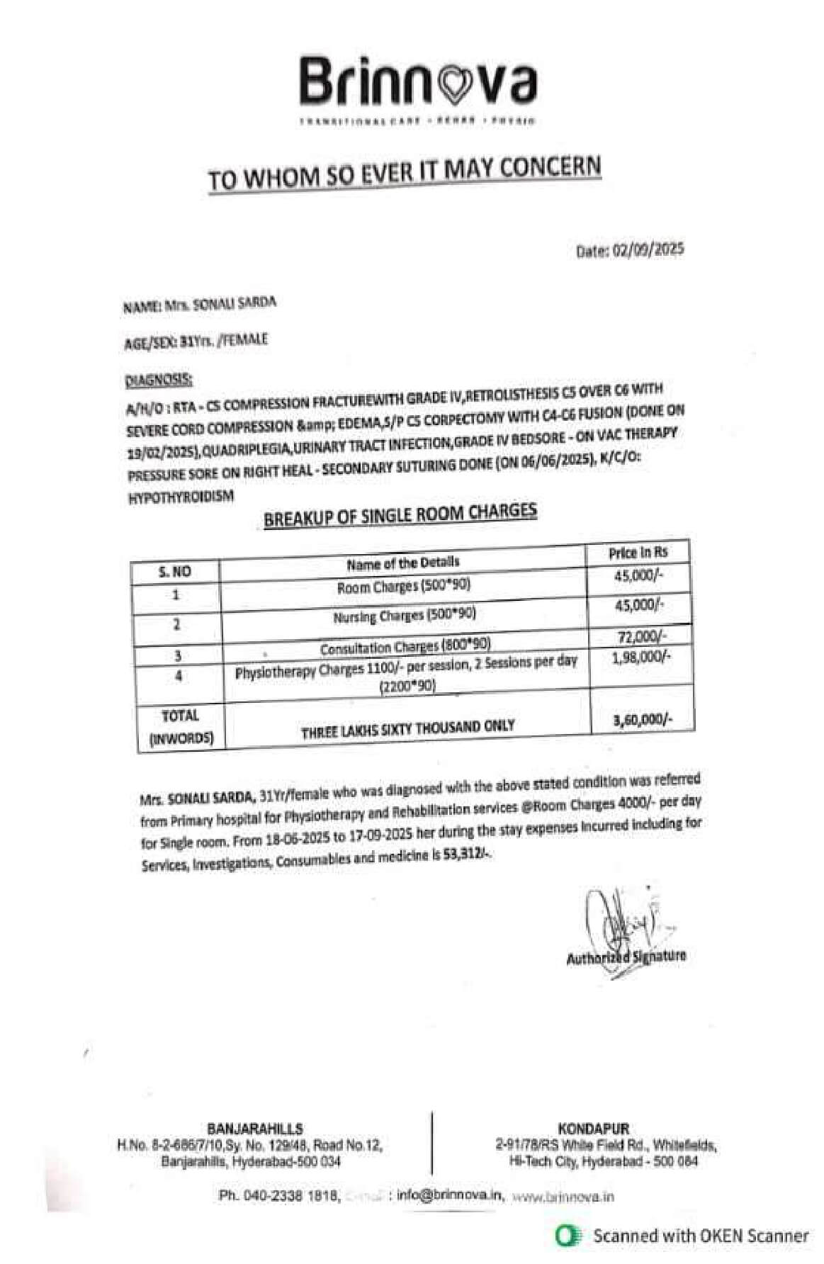 My name is Sonali Sarda. 18th February, while returning home after attending the Mahakumbh, I met with a terrible accident. The impact caused a C5 spinal fracture, leaving me paralysed and unable to move.