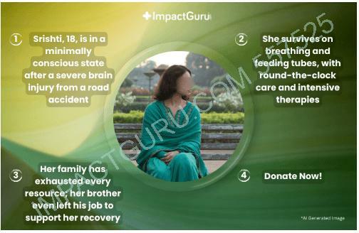 नोट: सृष्टि के सफ़र से आपको जोड़ने में मदद करने के लिए, हमने उनके संघर्षों को दर्शाने के लिए AI-जनरेटेड या स्टॉक इमेज का इस्तेमाल किया है। इन तस्वीरों का उद्देश्य गंभीर रूप से बीमार मरीज़ों और उनके परिवारों द्वारा झेली जाने वाली शारीरिक और भावनात्मक चुनौतियों को दर्शाना है। हालाँकि ये सृष्टि की असली तस्वीरें नहीं हैं, लेकिन ये उनकी लड़ाई के पीछे के दर्द और पीड़ा की एक दृश्यात्मक याद दिलाती हैं। आपका समर्थन (दान और कहानी साझा करना) उनके लिए आशा की किरण बन सकता है।
