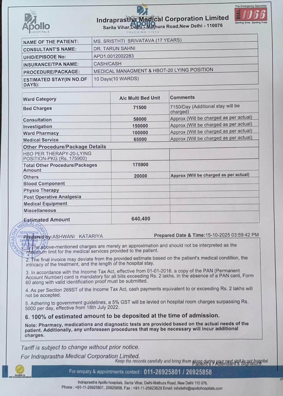 Note: To help you connect with Srishti's journey, we have used AI-generated or stock images to represent her struggles. These images aim to convey the physical and emotional challenges that critically ill patients and their families face. While they are not Srishti's actual photos, they serve as a visual reminder of the pain and suffering behind her fight. Your support (donation and story shares) can bring hope to her.