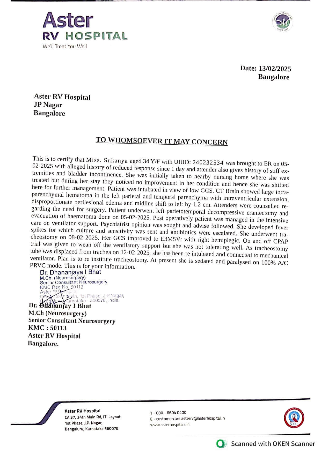എന്റെ പേര് സൂരജ്. എന്റെ പ്രിയ സഹോദരി സുകന്യ വേണുഗോപാലിന് ജീവിതത്തിനായി പൊരുതേണ്ടി വരികയാണ്. അവളെ ബ്രെയിൻ ഹെമറേജിന് ദിയോഗ്നം ചെയ്തു, ഇപ്പോൾ ബെംഗളൂരു, ആസ്റ്റർ RV ആശുപത്രിയിൽ അതീവ ഗുരുതര ചികിത്സയിലാണ്. ഡോക്ടർമാർ ഐസിയു പരിചരണം നിർദേശിച്ചിട്ടുണ്ടു്, അവളുടെ അവസ്ഥ ഇപ്പോഴും ഗുരുതരമാണ്. ജീവൻ രക്ഷാ ഉപകരണങ്ങളിൽ അവളെ നിരന്തരം നിരീക്ഷിക്കുകയും പ്രത്യേക ചികിത്സ നൽകുകയും ചെയ്യേണ്ടതുണ്ട്.
