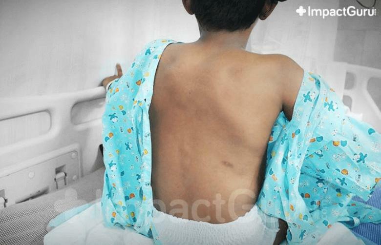 We have somehow found a way to arrange for one surgery for our little boy’s spine, but it was not enough. His spine is far too rigid, so, in order to help him stay erect, the doctors instructed us to fill 20 liters of water in a pouch and attach it to him via a pulley system.