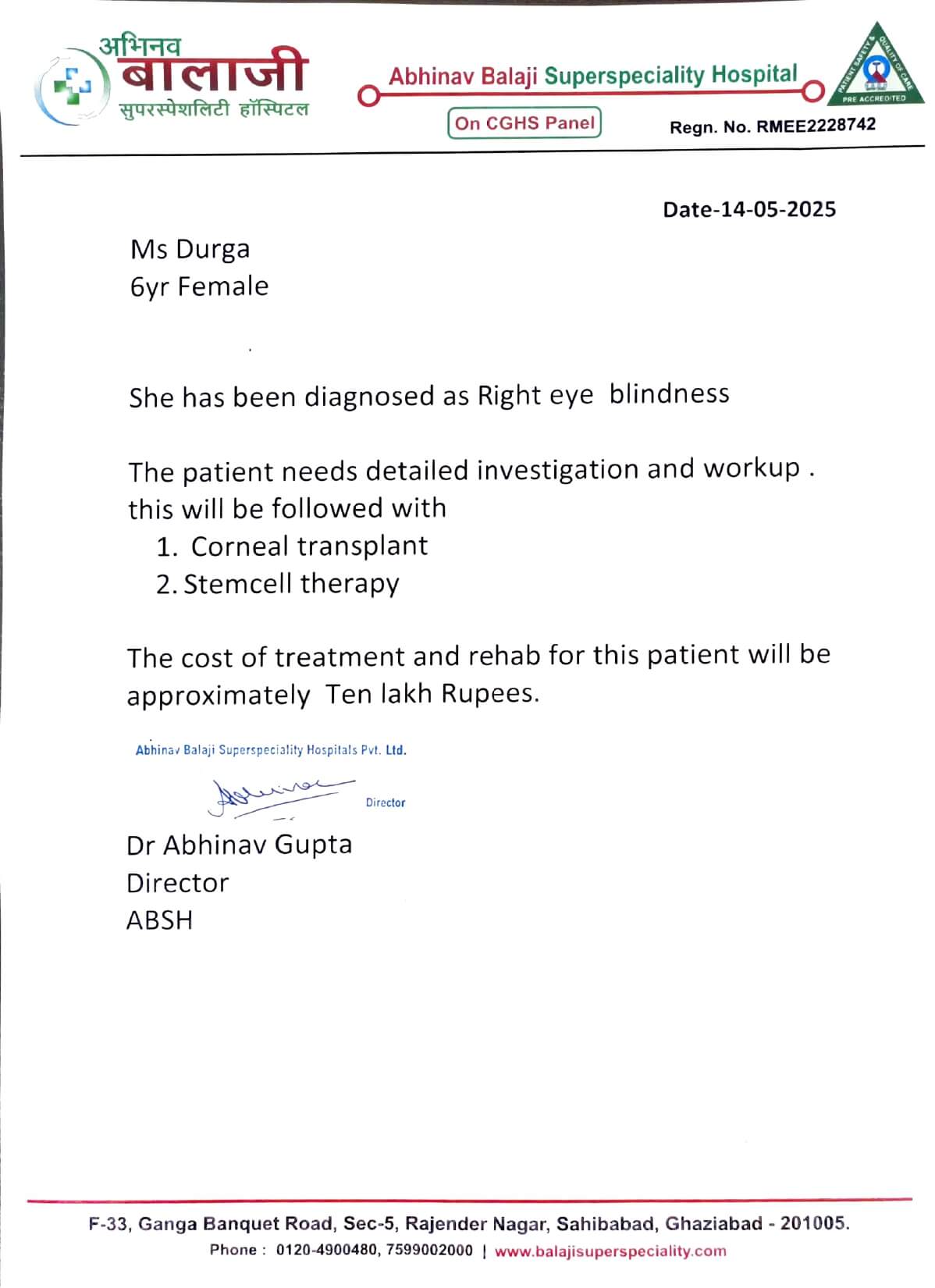 Durga’s condition requires urgent and advanced medical attention. After a thorough diagnosis, doctors have recommended a detailed investigation followed by a corneal transplant and stem cell therapy. These procedures are crucial to give her a real chance at regaining her vision. The estimated cost for her full treatment and rehabilitation is ₹10,00,000 — an amount that is far beyond what her family and our foundation can afford alone.
