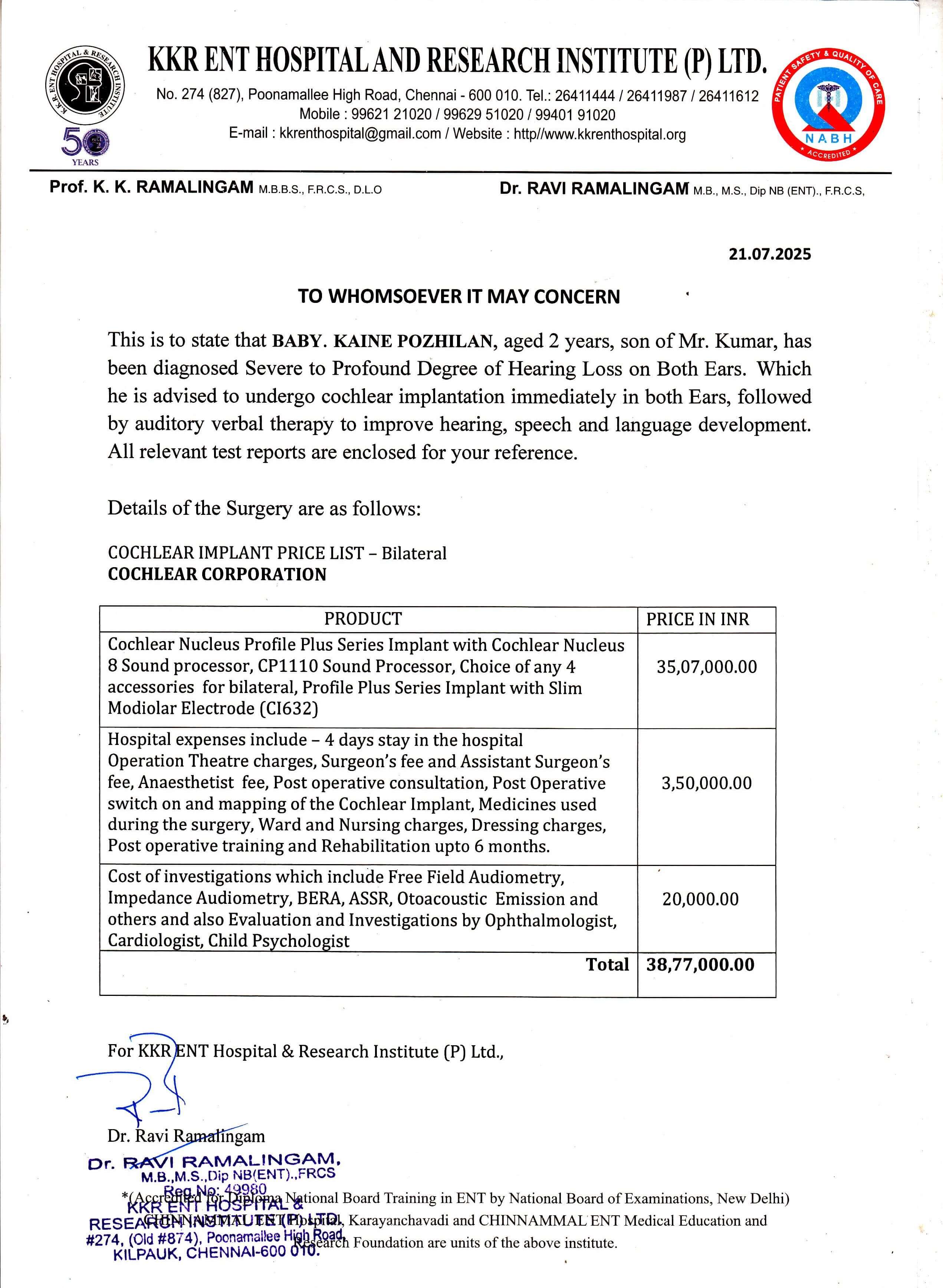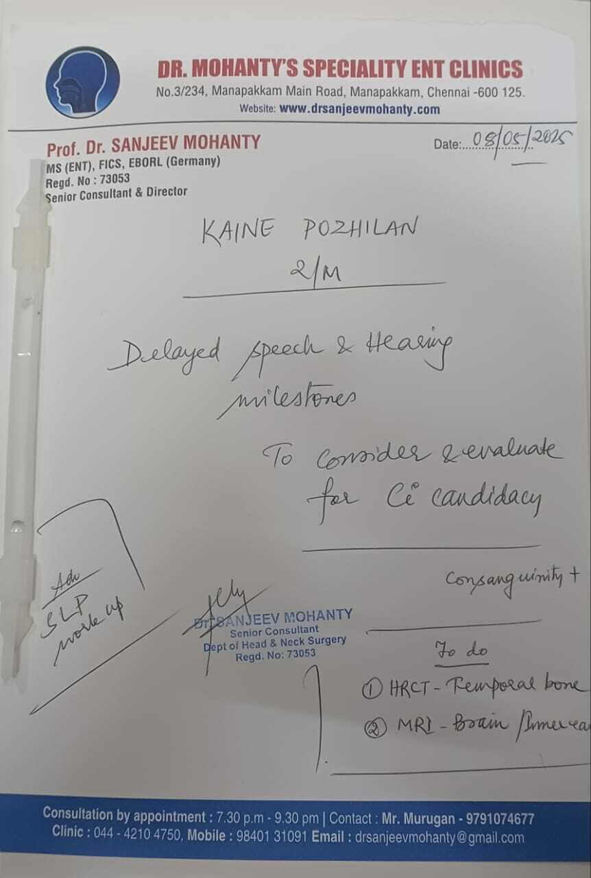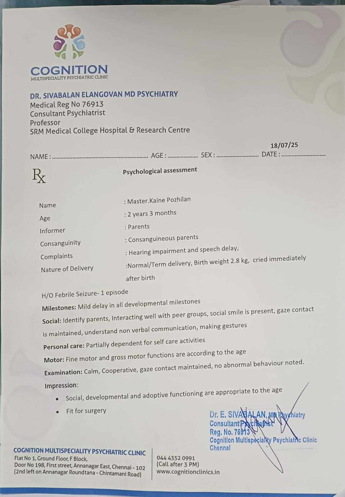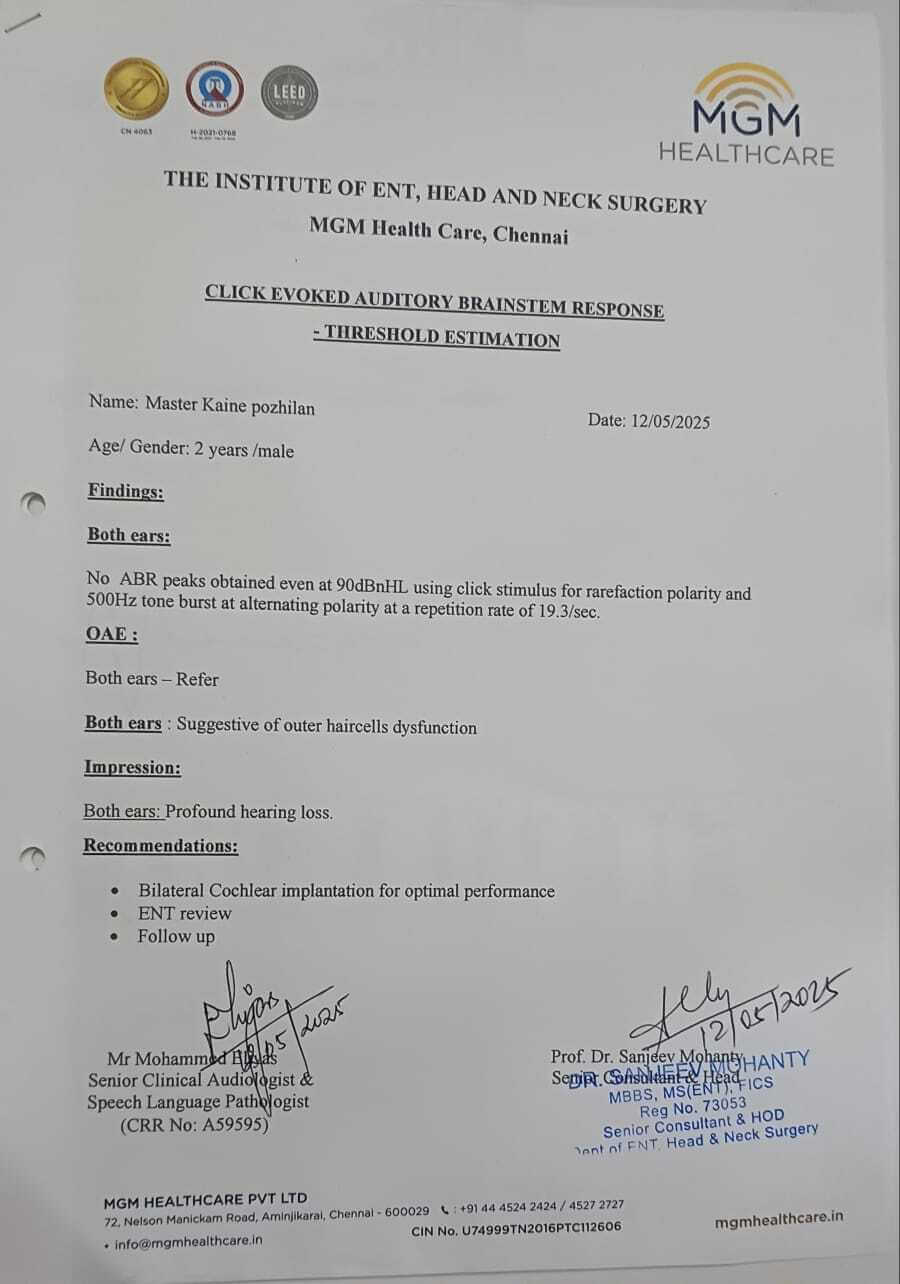 ஒரு வார்த்தை கூட கேட்காமல், ஒரு கிசுகிசு கூட கேட்காமல், உங்கள் பெற்றோரின் குரல்கள், உங்கள் நண்பர்களின் சிரிப்பு, குறிப்பாக இவ்வளவு இளம் வயதில் கேட்காமல் இருப்பது எப்படி இருக்கும் என்பதை உங்களால் கற்பனை செய்ய முடிகிறதா? எங்கள் 2 வயது மகன் முழுமையான அமைதியின் உலகில் வளர்ந்து வருகிறான். அவனுக்கு இருதரப்பு கோக்லியர் செல் செயலிழப்பு இருப்பது கண்டறியப்பட்டுள்ளது, அதாவது அவனுக்கு இரண்டு காதுகளிலும் முழுமையான காது கேளாமை (100%) உள்ளது. அவனது கோக்லியர் செல்கள் செயல்படாததால், கேட்கும் திறன் இல்லை. அவனால் ஒரு ஒலியைக் கூட கேட்டதில்லை. இந்த ஆழ்ந்த காது கேளாமை காரணமாக, அவனால் பேச்சையும் வளர்க்க முடியவில்லை. பெற்றோராக, அவனது வளர்ச்சியின் ஒரு முக்கிய பகுதி காணாமல் போய்விட்டதை அறிந்து, தொடர்பு கொள்ளவும் தொடர்பு கொள்ளவும் போராடுவதைப் பார்ப்பது மிகவும் வேதனையாக இருக்கிறது. அவனுக்கு கேட்கும் பரிசையும் சாதாரண வாழ்க்கைக்கான வாய்ப்பையும் வழங்க நாங்கள் தீவிரமாக போராடி வருகிறோம். எங்கள் மகனுக்கு கேட்கும் திறனை வழங்க அவசர கோக்லியர் இம்ப்லாண்ட் அறுவை சிகிச்சை மட்டுமே ஒரே வழி என்று மருத்துவர்கள் அறிவுறுத்தியுள்ளனர்.
