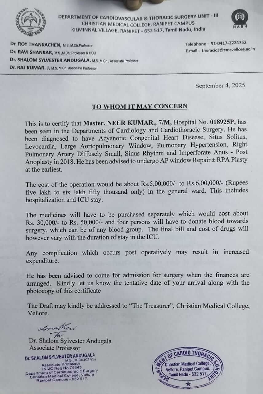 Doctors at Geetanjali Child Hospital, Supaul, have explained that his condition is critical, and immediate surgery is his only chance at recovery. Neer is currently hospitalised, and while the medical team is doing everything they can, the costs are mounting each day. His fragile heart is struggling, and every second feels like a race against time.