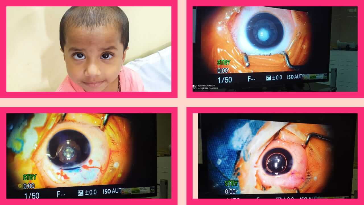 This girl child aged 2 yrs , from deep interior Malavalli, in Mandya district. Born with Right Eye cataract being detected just few days ago . This was due to less common cause called PFV ( persistent fetal Vasculature ) leading to opacification of back of human crystalline lens and results in total cataract, lazy eye etc . This kid had cataract surgery+ IOL implantation+ Primary posterior capsulotomy+ Anterior Vitrectomy - state of art procedure for this condition Today morning. We share with you images of child, eye under surgical microscope, After removing cataract with dense plaque in back of the Lens bag and final picture at conclusion. Thank you yet again on behalf of parents of this lovely girl and on behalf of Usha Kiran.
