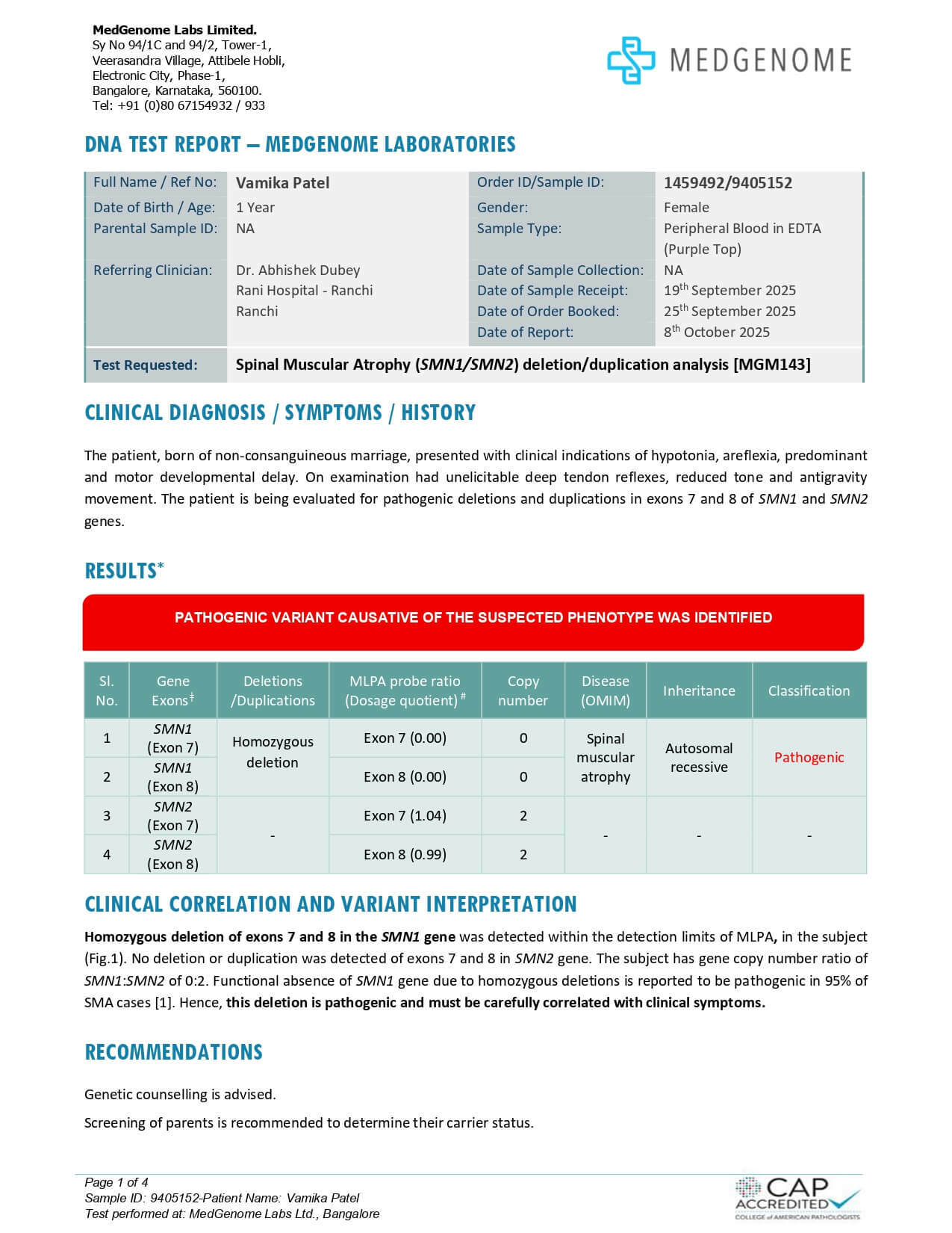 Our precious Vamika has been diagnosed with Spinal Muscular Atrophy (SMA) Type 1, a rare and devastating genetic disorder. SMA gradually weakens the muscles needed to sit, stand, walk—and eventually, even breathe. Watching our little girl struggle with simple milestones that other children achieve so easily has been heartbreaking beyond words.