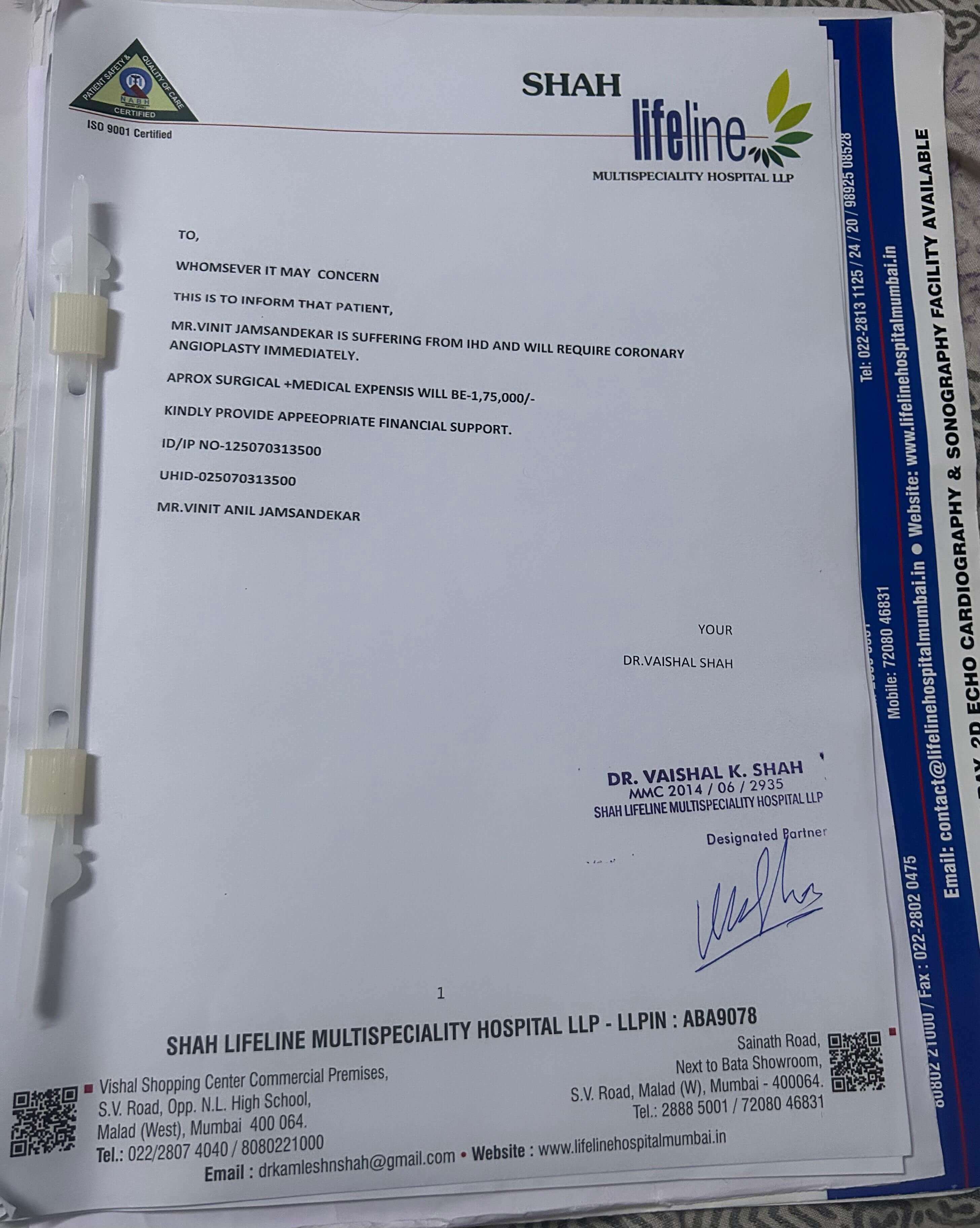 I have been the sole earning member of my family. My wife is a homemaker, and I have two children who are studying as well as an 86-year-old mother who await my healing. With limited income from my small brokerage business, we have already sold and pledged assets to keep going, but the mounting expenses are overwhelming.