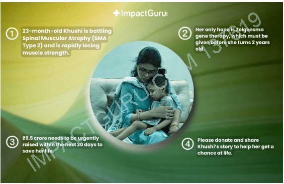 बच्ची खुशि को स्पाइनल मस्कुलर एट्रोफी (SMA) टाइप 2, एक आनुवंशिक बीमारी है।