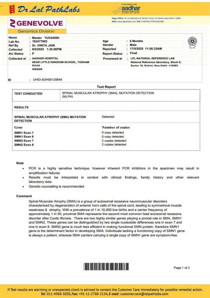 We are deeply grateful for your love and support for Baby Yuvansh, who is bravely fighting Spinal Muscular Atrophy (SMA) Type 1. A few months ago, after several tests at Nehru Hospital, PGI, Chandigarh, doctors gave us the heartbreaking news of his diagnosis. Since then, your prayers and kindness have given us the strength to continue this fight.