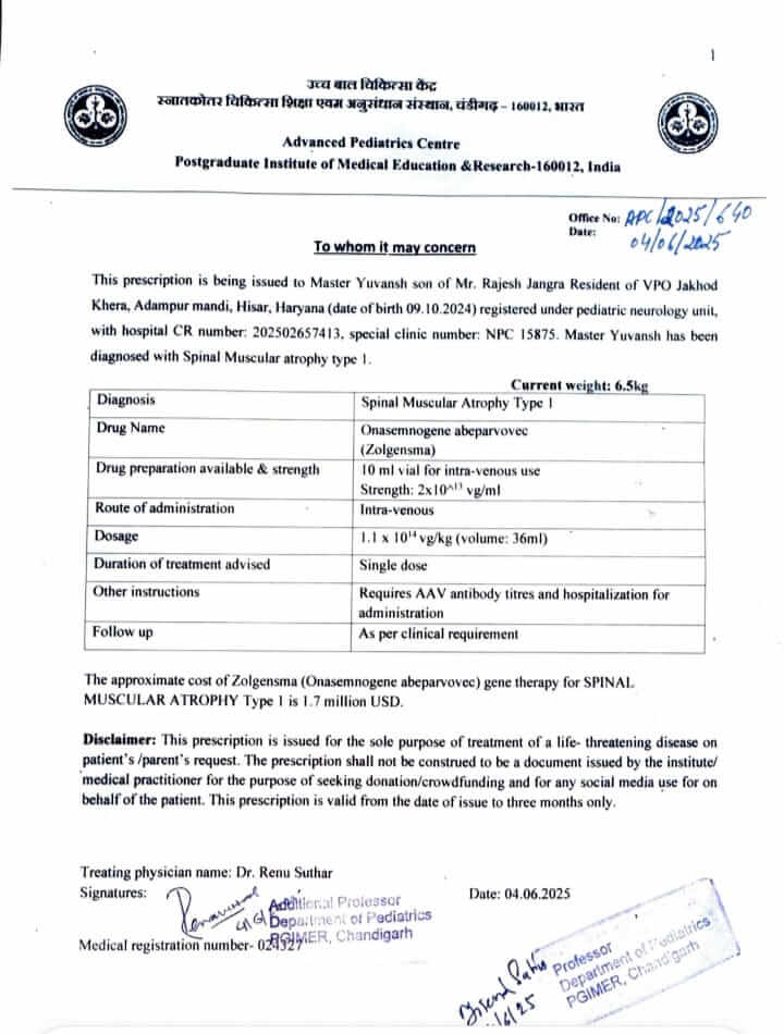 At present, Yuvansh is at home receiving regular physiotherapy and supportive medication, which helps him stay stable for now. However, these are only temporary measures. The only life-saving treatment for SMA Type 1 is Zolgensma, a one-time gene therapy that can replace the missing gene and stop the progression of this cruel disease. The cost of this treatment is an overwhelming ₹14 crore, and every passing day matters as his muscles grow weaker.
