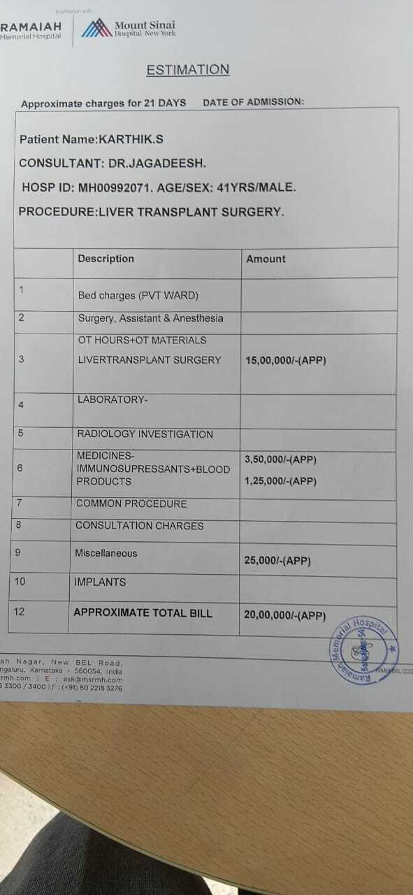 My name is Karthik S, and I am in urgent need of financial help for my liver transplant. I have been battling liver failure and undergoing treatment at M S Ramaiah Memorial Hospital, New Bel Road, Bengaluru. My condition has deteriorated to the point where a transplant is my only hope for survival.