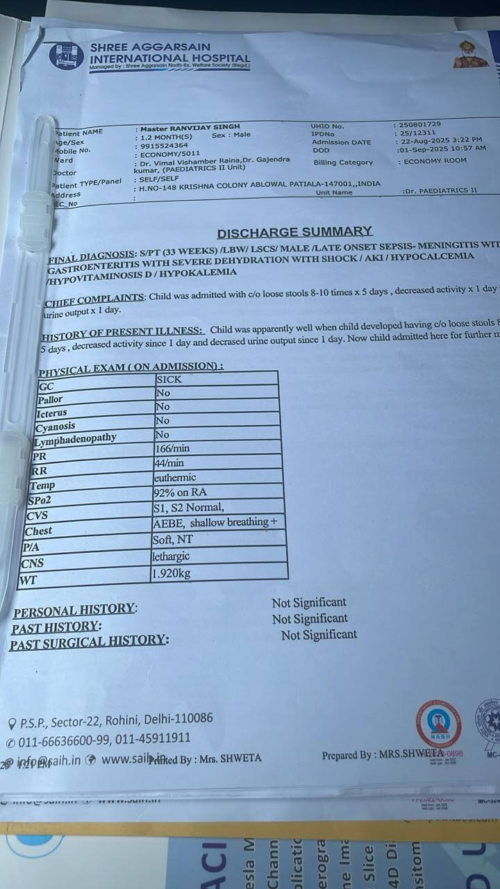 बेबी रणविजय का जन्म 31 जुलाई 2025 को समय से पहले हुआ था और जन्म के बाद उसे पहले ही हफ्ते एनआईसीयू (NICU) में रहना पड़ा। जब हमें लगा कि अब वह सुरक्षित है, तभी एक और बड़ी मुसीबत आ गई। 22 अगस्त को उसे दोबारा दिल्ली के महाराजा अग्रसेन अस्पताल ले जाना पड़ा, जहाँ डॉक्टरों ने उसके लीवर, किडनी और दिमाग में गंभीर संक्रमण पाया। उसका नन्हा शरीर संघर्ष कर रहा है और उसकी ज़िंदगी बचाने के लिए उसे कम से कम एक हफ़्ते तक और एनआईसीयू देखभाल की आवश्यकता है।