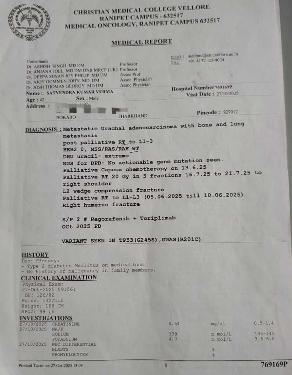 हमारे परिवार का दुःस्वप्न मई 2025 में शुरू हुआ, जब मेरे चाचा को CMC वेल्लोर में गंभीर दर्द और कमजोरी के कारण भर्ती कराया गया। कई परीक्षणों के बाद, डॉक्टरों ने उन्हें यह दुर्लभ कैंसर बताया जो मूत्राशय और आस-पास के अंगों को प्रभावित करता है। तब से उनका जीवन जीवित रहने की निरंतर लड़ाई बन गया है।