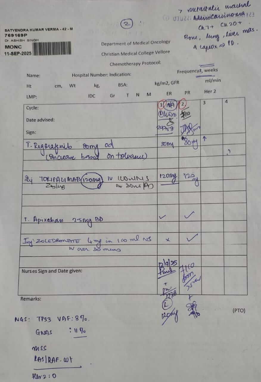 He underwent 4 cycles of chemotherapy, followed by immunotherapy and targeted therapy. The treatments were extremely painful and left him bedridden for months. The side effects of chemotherapy severely damaged his spine, and he had to undergo two major spine surgeries.