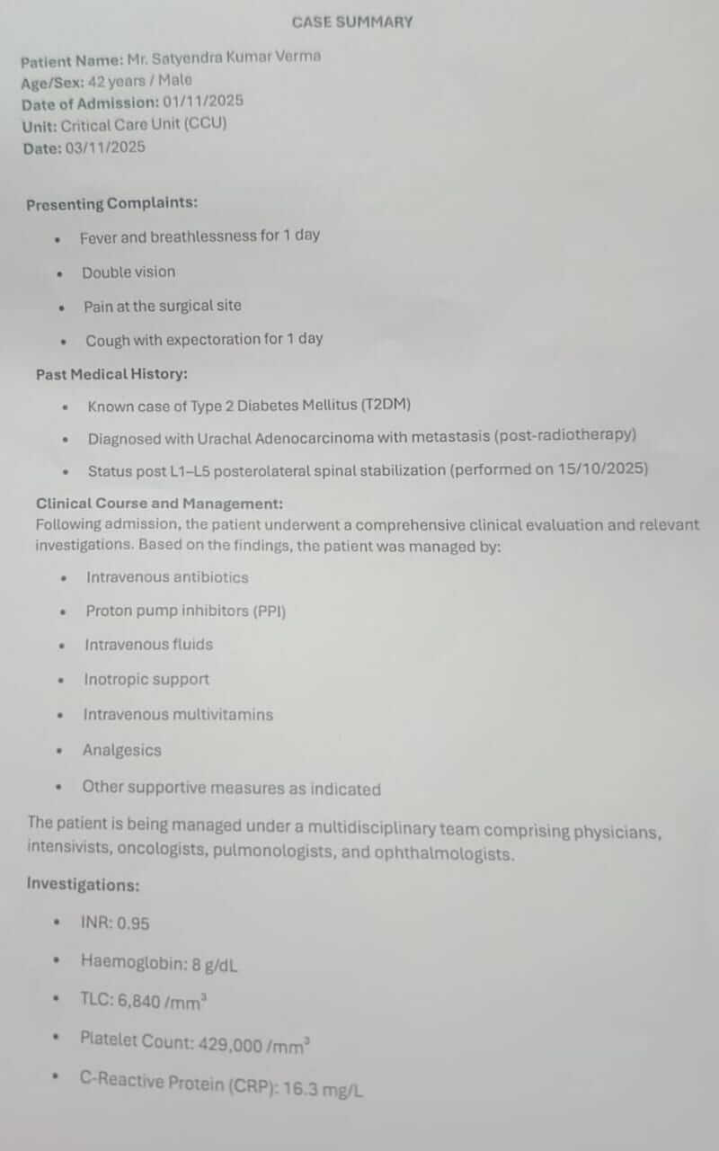 मेरा नाम निधि रानी है, और मैं अपने प्रिय चाचा, श्री सत्येंद्र कुमार वर्मा (42 वर्ष) के लिए सहायता मांग रही हूँ। वह Urachal Adenocarcinoma नामक एक दुर्लभ और आक्रामक कैंसर से जूझ रहे हैं।