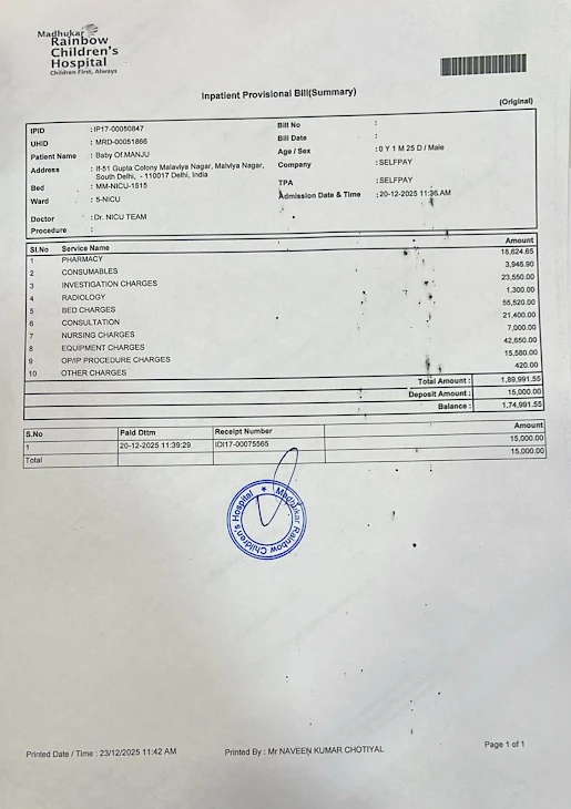 The treatment is extremely costly. The total estimated expense for NICU care, medications, and ongoing treatment is ₹7,00,000. As a family, we are unable to afford this enormous amount, and our savings are not enough to cover the expenses.