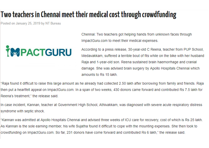 Both the families started respective crowdfunding campaigns on ImpactGuru.com, a medical crowdfunding platform to arrange money for the treatment. As they waited in the hospital, the word was spread and a total of 230 donors came together and contributed to their beloved teacher Kannan. While Reena received contributions from a total of 430 donors who looked up to her for being a wonderful teacher.